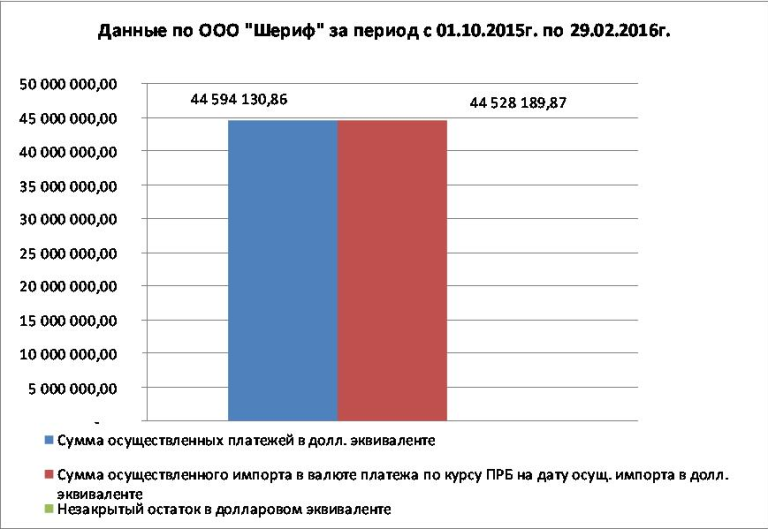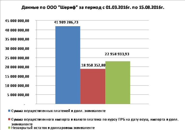 Превышение проплаченного импорта над фактическими поступлением товара означает, что крупные импортёры пользуются законодательно установленными сроками возврата (ввоза) товаров в 210 календарных дней и не спешат осуществлять ввоз товаров, приобретённых за счёт иностранной валюты, хотя до 1 марта 2016 года такой ситуации не наблюдалось. Таким образом, складывается впечатление, что крупными импортёрами валюта покупается под контракты «впрок», тем самым происходит бесплатное кредитование других экономик. При этом слухи о возможном кризисе продовольствия и топлива распространяются среди населения всё чаще. Вот тут как раз и напрашивается вопрос - кому это нужно? Центральным банком в качестве одной из мер, направленных на стабилизацию внутреннего валютного рынка, ещё в начале марта 2016 года предлагалось сокращение сроков репатриации (возврата) валютной выручки, установленной Законом ПМР «О валютном регулировании и валютном контроле» с действующих 210 дней до 90 дней, с закреплением реального и действенного механизма применения мер ответственности за их нарушение. Однако, данная законодательная инициатива не нашла поддержки у депутатского корпуса, в большинстве своём являющимися руководителями крупных предприятий республики. Налицо очередной конфликт интересов!!! Особенно показательны данные о возросшем незакрытом импорте самых крупных импортёров, таких как ООО «Шериф» и СЗАО «Интерднестрком». ООО «Шериф» График 1.