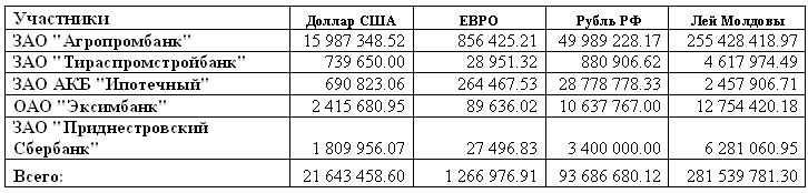 Совокупный спрос на торгах валютного аукциона Приднестровского республиканского банка 10 октября 2016 года составил в эквиваленте 38 785 083.29 долларов США. Предложенная иностранная валюта была распределена следующим образом: - 30% от суммы предложенной валюты разделено поровну между участниками аукциона; - остаток разделён пропорционально поданным заявкам. Исходя из заявок клиентов на покупку молдавских леев, распределение иностранной валюты изложено в таблице: Отдел общественных коммуникаций ПРБ |