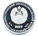 Аверс монеты: в центре – изображение Государственного герба Приднестровской Молдавской Республики; по кругу – надписи: вверху – «ПРИДНЕСТРОВСКИЙ РЕСПУБЛИКАНСКИЙ БАНК», внизу – «100 РУБЛЕЙ»; в нижней части под гербом  – год выпуска монеты «2017», слева – логотип изготовителя, государственное пробирное клеймо, справа – обозначение металла, проба сплава.