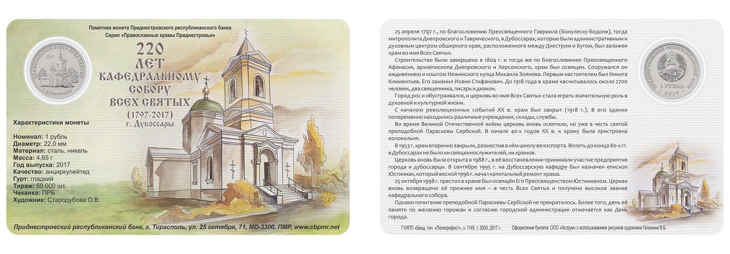 Приднестровский республиканский банк выпустил буклет с памятной монетой из недрагоценных металлов номиналом 1 рубль «Кафедральный собор Всех Святых г. Дубоссары» серии «Православные храмы Приднестровья». |