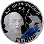 - из драгоценного металла (серебра) номиналом 20 рублей «160 лет со дня рождения Циолковского К.Э.» серии «Освоение космоса»;