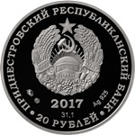 Аверс монеты: в центре – изображение Государственного герба Приднестровской Молдавской Республики; по кругу – надписи: вверху ­­­­­– «ПРИДНЕСТРОВСКИЙ РЕСПУБЛИКАНСКИЙ БАНК», внизу – «20 РУБЛЕЙ»; в нижней части под гербом  – год выпуска монеты «2017», ниже – содержание химически чистого металла в граммах, слева – логотип изготовителя, государственное пробирное клеймо, справа – обозначение металла, проба сплава.