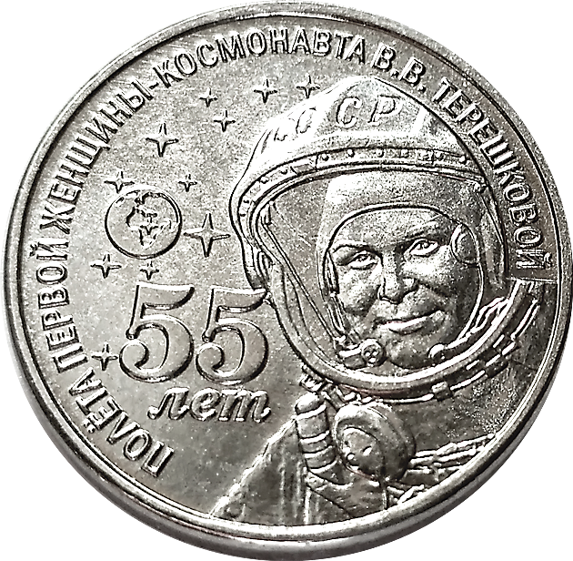 С 19 июня 2018 года вводятся в обращение памятные монеты Приднестровского республиканского банка из недрагоценных металлов достоинством 1 рубль «55 лет полета первой женщины-космонавта В.В. Терешковой» серии «Освоение космоса».