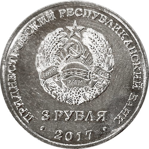 Описание монеты: Аверс монет: в центре – изображение Государственного герба Приднестровской Молдавской Республики; по кругу – надписи: вверху – «ПРИДНЕСТРОВСКИЙ РЕСПУБЛИКАНСКИЙ БАНК», в нижней части под гербом – «3 РУБЛЯ»; внизу – «2018». Реверс монеты: в центре – изображение ротонды и скульптуры «Жажда» в парке им. Д.К. Родина, с. Чобручи; вверху – надпись «с. ЧОБРУЧИ 1573-2018»; внизу – надпись «445 ЛЕТ». |