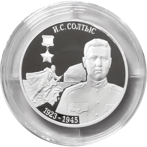 Описание монеты: Аверс монеты: в центре – изображение Государственного герба Приднестровской Молдавской Республики; по кругу – надписи: вверху – «ПРИДНЕСТРОВСКИЙ РЕСПУБЛИКАНСКИЙ БАНК», внизу – «10 РУБЛЕЙ»; в нижней части под гербом – год выпуска монеты «2018», ниже – содержание химически чистого металла в граммах, слева – логотип изготовителя, государственное пробирное клеймо, справа – обозначение металла, проба сплава. Реверс монеты: в центре – портрет Героя Советского Союза И.С. Солтыса, слева – изображение фрагмента боя и медали «Золотая Звезда», вверху – надпись «И.С. СОЛТЫС», внизу – годы жизни «1923-1945». |