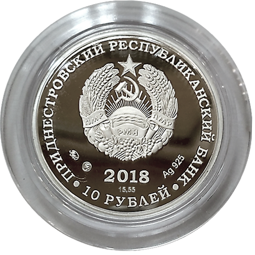 Описание монеты: Аверс монеты: в центре – изображение Государственного герба Приднестровской Молдавской Республики; по кругу – надписи: вверху – «ПРИДНЕСТРОВСКИЙ РЕСПУБЛИКАНСКИЙ БАНК», внизу – «10 РУБЛЕЙ»; в нижней части под гербом – год выпуска монеты «2018», ниже – содержание химически чистого металла в граммах, слева – логотип изготовителя, государственное пробирное клеймо, справа – обозначение металла, проба сплава. Реверс монеты: в центре – портрет генерала от кавалерии Раевского Н.Н. на фоне Бендерской крепости и фрагмента атаки, вверху – надпись «РАЕВСКИЙ Н.Н. 1771-1829 г.г.», внизу – изображение лавровой ветви. |