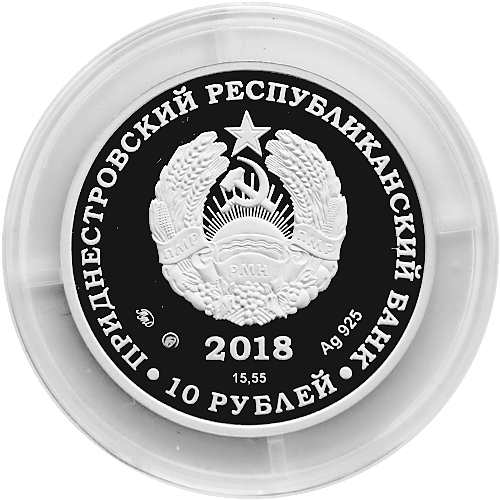 Описание монеты: Аверс монеты: в центре – изображение Государственного герба Приднестровской Молдавской Республики; по кругу – надписи: вверху – «ПРИДНЕСТРОВСКИЙ РЕСПУБЛИКАНСКИЙ БАНК», внизу – «10 РУБЛЕЙ»; в нижней части под гербом – год выпуска монеты «2018», ниже – содержание химически чистого металла в граммах, слева – логотип изготовителя, государственное пробирное клеймо, справа – обозначение металла, проба сплава. Реверс монеты: в центре – портрет генерала-фельдмаршала Барклая де Толли М.Б. на фоне Бендерской крепости и солдат, участвующих в её осаде, вверху – надпись «БАРКЛАЙ ДЕ ТОЛЛИ М.Б. 1761-1818 г.г.», внизу – изображение лавровой ветви. |