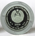 Аверс монеты: в центре – изображение Государственного герба Приднестровской Молдавской Республики; по кругу – надписи: вверху ­­­­­– «ПРИДНЕСТРОВСКИЙ РЕСПУБЛИКАНСКИЙ БАНК», внизу – «10 РУБЛЕЙ»; в нижней части под гербом – год выпуска монеты «2019», ниже – содержание химически чистого металла в граммах, слева – логотип изготовителя, государственное пробирное клеймо, справа – обозначение металла, проба сплава.
