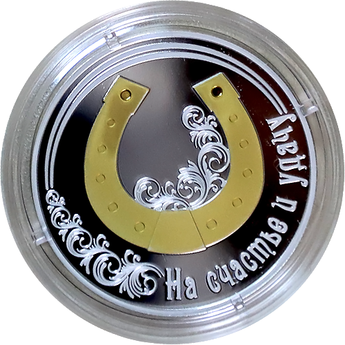 Реверс монеты: в центре – стилизованное позолоченное изображение подковы, украшенной ажурной ветвью; вверху по кругу – две нити, внизу по кругу – ажурная ветвь, надпись «НА СЧАСТЬЕ И УДАЧУ».