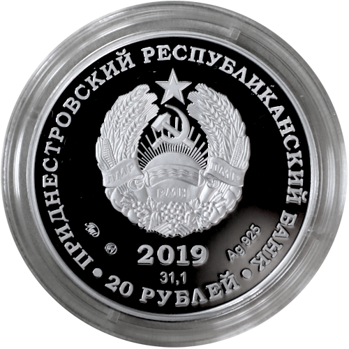 Аверс монеты: в центре – изображение Государственного герба Приднестровской Молдавской Республики; по кругу – надписи: вверху – «ПРИДНЕСТРОВСКИЙ РЕСПУБЛИКАНСКИЙ БАНК», внизу – «20 РУБЛЕЙ»; в нижней части под гербом  – год выпуска монеты «2019», ниже – содержание химически чистого металла в граммах, слева – логотип изготовителя, государственное пробирное клеймо, справа – обозначение металла, проба сплава.