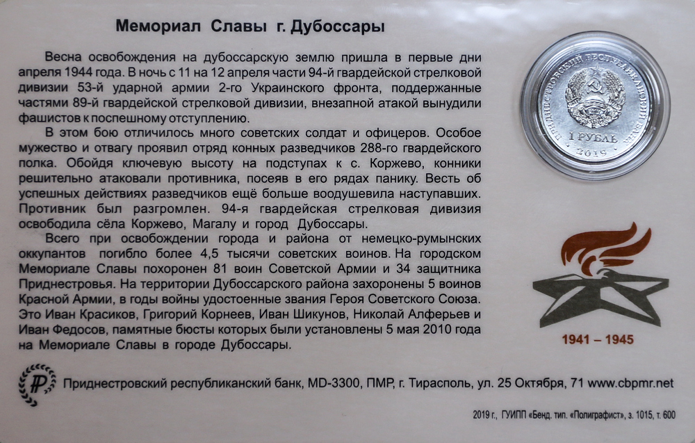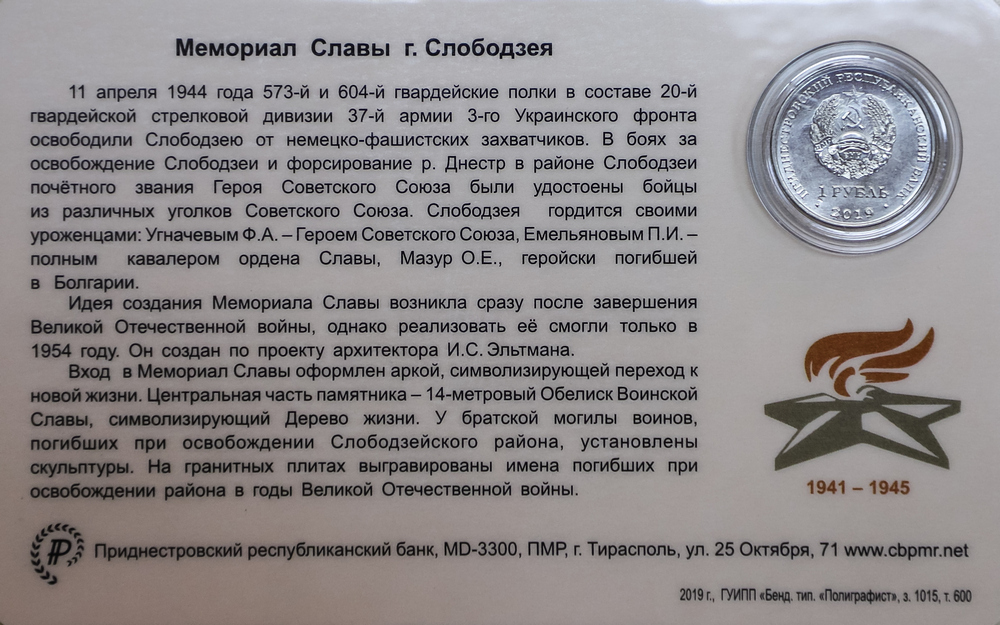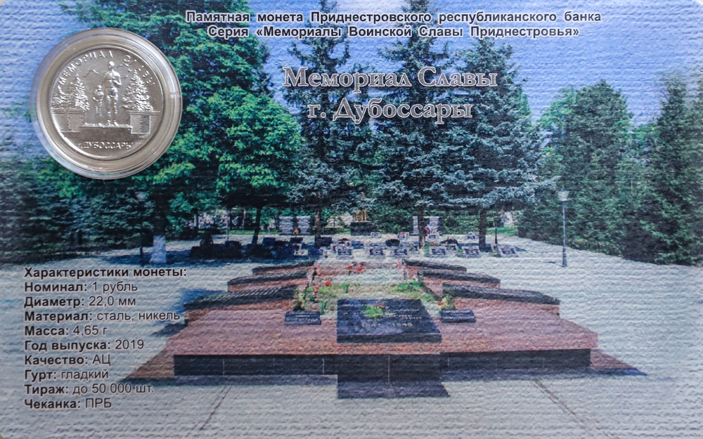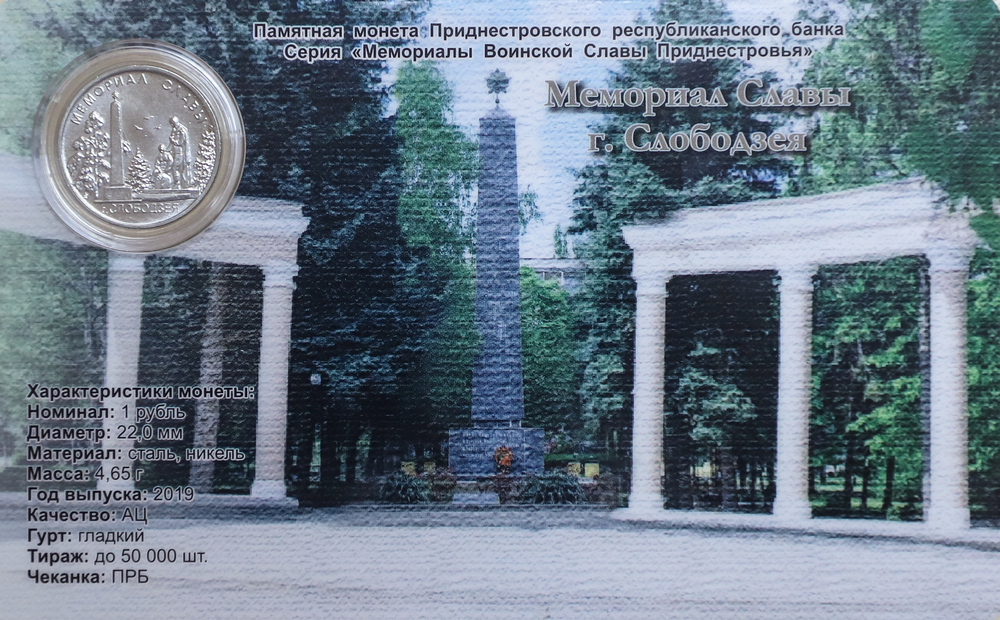 Приднестровский республиканский банк выпустил буклеты с памятными монетами из недрагоценных металлов номиналом 1 рубль «Мемориал славы г. Слободзея» и «Мемориал славы г. Дубоссары» серии «Мемориалы воинской славы Приднестровья».