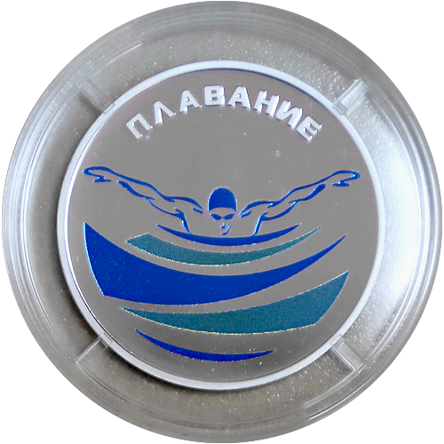 Описание монеты: Аверс монеты: в центре – изображение Государственного герба Приднестровской Молдавской Республики; по кругу – надписи: вверху – «ПРИДНЕСТРОВСКИЙ РЕСПУБЛИКАНСКИЙ БАНК», внизу – «10 РУБЛЕЙ»; в нижней части под гербом – год выпуска монеты «2019», ниже – содержание химически чистого металла в граммах, слева – логотип изготовителя, государственное пробирное клеймо, справа – обозначение металла, проба сплава. Реверс монеты: в центре – стилизованное цветное изображение пловца, вверху – по кругу надпись «ПЛАВАНИЕ».