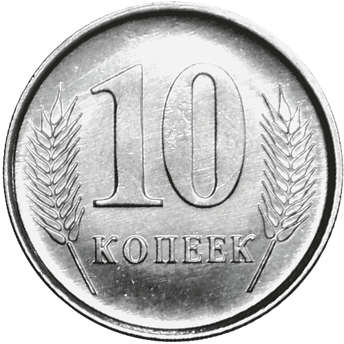 в центре отчеканена цифра «10», обрамленная стилизованными колосьями пшеницы; под номиналом – надпись «копеек».
