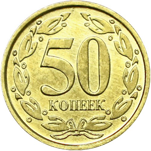 в центре отчеканена цифра «50», обрамленный стилизованным лавровым венком; под номиналом – надпись «копеек».