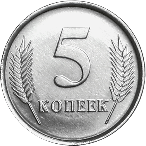 в центре отчеканена цифра «5», обрамленная стилизованными колосьями пшеницы; под номиналом – надпись «копеек».