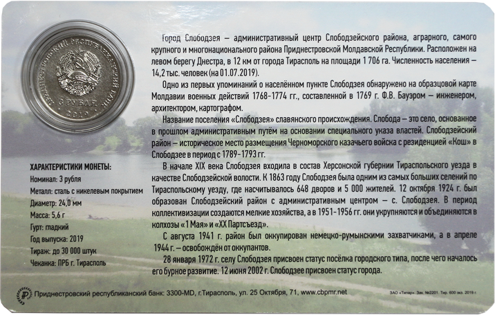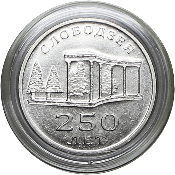 С 16 сентября 2019 года вводятся в обращение памятные монеты Приднестровского республиканского банка из недрагоценных металлов достоинством 3 рубля «250 лет г. Слободзея» серии «Приднестровье-край родной». Памятные монеты являются денежными знаками Приднестровского республиканского банка, выступают средством обращения и платежа на территории Приднестровской Молдавской Республики и принимаются по их номинальной стоимости. Характеристика монеты:
