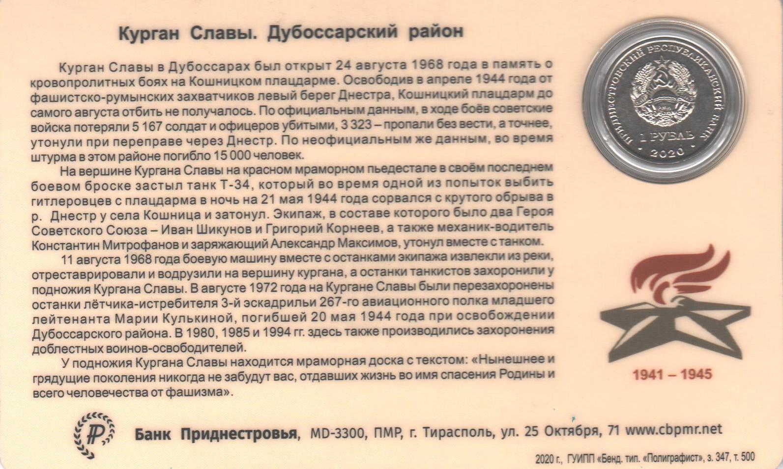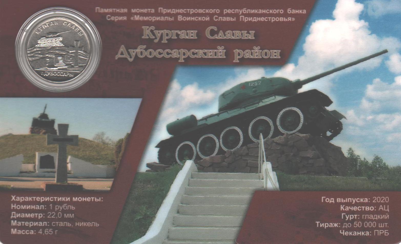 Приднестровский республиканский банк выпустил буклеты с памятными монетами из недрагоценных металлов номиналом 1 рубль «Курган Славы. Дубоссарский район» серии «Мемориалы воинской славы Приднестровья».