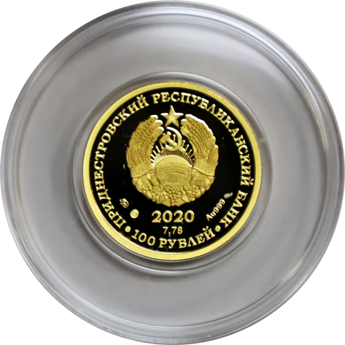 Аверс монеты: в центре – изображение Государственного герба Приднестровской Молдавской Республики; по кругу – надписи: вверху– «ПРИДНЕСТРОВСКИЙ РЕСПУБЛИКАНСКИЙ БАНК», внизу – «100 РУБЛЕЙ»; в нижней части под гербом – год выпуска монеты «2020», ниже – содержание химически чистого металла в граммах, слева – логотип изготовителя, государственное пробирное клеймо, справа – обозначение металла, проба сплава.