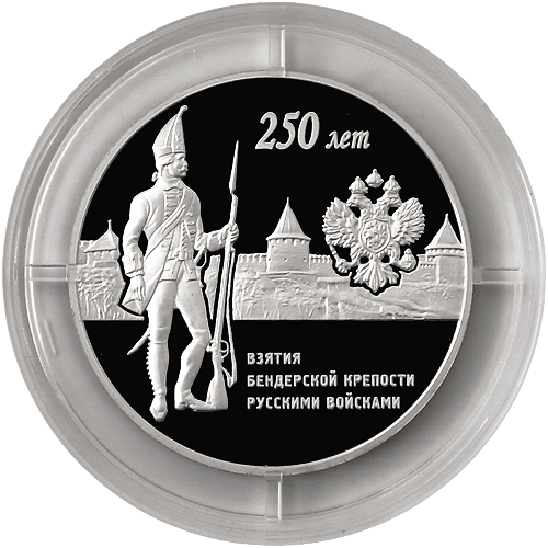 С 16 сентября 2020 года в обращение вводится памятная серебряная монета Приднестровского республиканского банка достоинством 10 рублей «250 лет взятия Бендерской крепости русскими войсками» серии «Россия в истории Приднестровья». Памятная монета является денежным знаком Приднестровского республиканского банка, выступает средством обращения и платежа на территории Приднестровской Молдавской Республики и принимается по ее номинальной стоимости. Каждая монета имеет идентификационный сертификат (паспорт), упакована в прозрачную капсулу и представлена в футляре. Характеристика монеты: