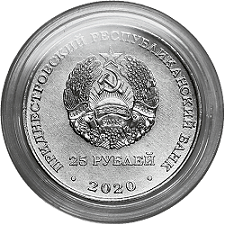 Описание монет: Аверс: в центре – изображение Государственного герба Приднестровской Молдавской Республики; по кругу – надписи: вверху – «ПРИДНЕСТРОВСКИЙ РЕСПУБЛИКАНСКИЙ БАНК», внизу – «25 РУБЛЕЙ»; в нижней части под гербом – «2020». Реверс: в центре – изображение монумента «Родина-мать», над ним по кругу – надпись «ГОРОД-ГЕРОЙ КИЕВ», слева в две строки – надпись «1941-1945», под ней лавровая ветвь; справа – медаль «Золотая Звезда». |