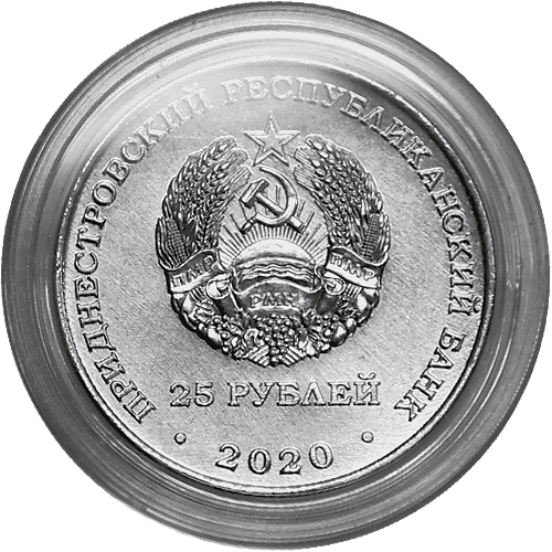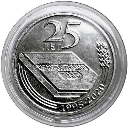 Описание монеты: Аверс монеты: в центре – изображение Государственного герба Приднестровской Молдавской Республики; по кругу – надписи: вверху– «ПРИДНЕСТРОВСКИЙ РЕСПУБЛИКАНСКИЙ БАНК», внизу – «25 РУБЛЕЙ»; в нижней части под гербом – «2020». Реверс монеты: в центре – изображение книги с надписью «КОНСТИТУЦИЯ ПМР», вверху – надпись в две строки «25 ЛЕТ»; внизу на фоне колосьев – надпись «1995-2020». |