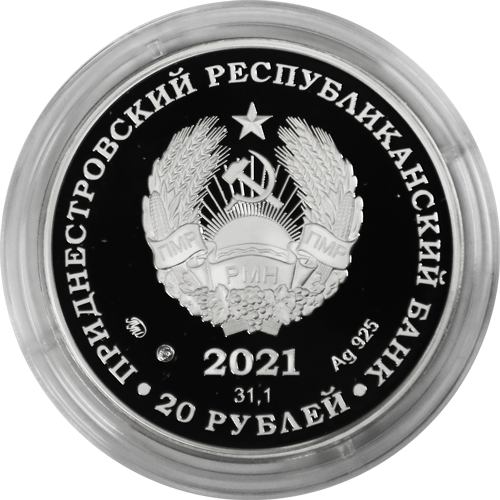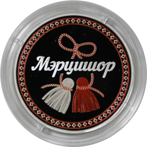 Описание монеты: Аверс монеты: в центре – изображение Государственного герба Приднестровской Молдавской Республики; по кругу – надписи: вверху – «ПРИДНЕСТРОВСКИЙ РЕСПУБЛИКАНСКИЙ БАНК», внизу – «20 РУБЛЕЙ»; в нижней части под гербом – год выпуска монеты «2021», ниже – содержание химически чистого металла в граммах, слева – логотип изготовителя, государственное пробирное клеймо, справа – обозначение металла, проба сплава. Реверс монеты: в центре – крупным планом цветное изображение мэрцишора – двух бутоньерок из ниток белого и красного цвета, в середине – надпись «МЭРЦИШОР»; по окружности – цветная полоса с национальным орнаментом. |