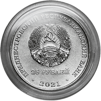 Характеристика монет: Номинал: 25 рублей Описание монет: Аверс монет: в центре – изображение Государственного герба Приднестровской Молдавской Республики; по кругу – надписи: вверху – «ПРИДНЕСТРОВСКИЙ РЕСПУБЛИКАНСКИЙ БАНК», внизу – «25 РУБЛЕЙ»; в нижней части под гербом – «2021». Реверс монеты: в центре – стилизованное изображение пятиконечной звезды, в середине которой в две строки надпись: «АРМИЯ ПРИДНЕСТРОВЬЯ», на лучах звезды слева – надпись «1991», справа – надпись «2021»; вверху по кругу – надпись: «ВООРУЖЕННЫЕ СИЛЫ ПМР», внизу в две строки – надпись «30 ЛЕТ» в обрамлении лавровых ветвей. |