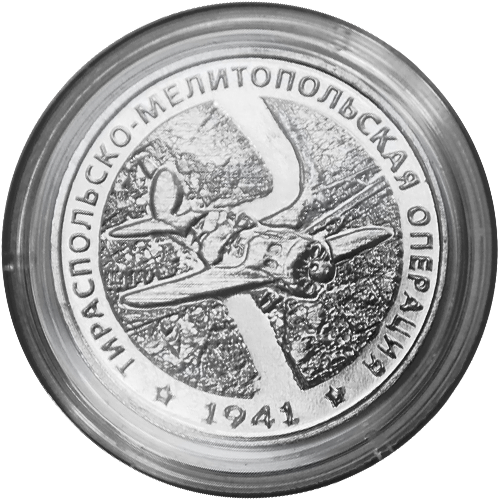 Описание монет: Аверс монет: в центре – изображение Государственного герба Приднестровской Молдавской Республики; по кругу – надписи: вверху– «ПРИДНЕСТРОВСКИЙ РЕСПУБЛИКАНСКИЙ БАНК», внизу – «25 РУБЛЕЙ»; в нижней части под гербом – «2021». Реверс монеты: в центре – изображение летящего самолета, под ним графическое изображение полей и реки, вверху по кругу – надпись: «ТИРАСПОЛЬСКО-МЕЛИТОПОЛЬСКАЯ ОПЕРАЦИЯ», внизу – надпись «1941» в обрамлении пятиконечных звёзд. |