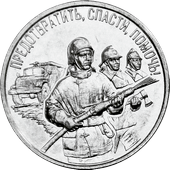 Реверс монеты: в центре – изображение трёх пожарных в шлемах и боевой экипировке разных времён, один из которых держит в руках пожарный рукав, другой – топор; слева – изображение пожарного автомобиля; вверху по кругу – надпись «ПРЕДОТВРАТИТЬ, СПАСТИ, ПОМОЧЬ!».