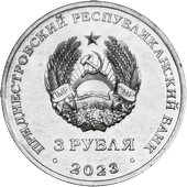 Аверс монеты: в центре – изображение Государственного герба Приднестровской Молдавской Республики; по кругу – надписи: вверху – «ПРИДНЕСТРОВСКИЙ РЕСПУБЛИКАНСКИЙ БАНК», внизу – «2023»; в нижней части под гербом – номинал «3 РУБЛЯ».