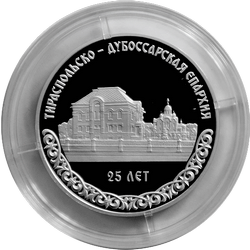 – из драгоценного металла (серебра) номиналом 10 рублей «25 лет Тираспольско-Дубоссарской епархии» серии «Православные храмы Приднестровья»;