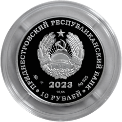 Аверс монеты: в центре – изображение Государственного герба Приднестровской Молдавской Республики; по кругу – надписи: вверху – «ПРИДНЕСТРОВСКИЙ РЕСПУБЛИКАНСКИЙ БАНК», внизу – «10 РУБЛЕЙ»; в нижней части под гербом – год выпуска монеты «2023», ниже – содержание химически чистого металла в граммах, слева – логотип изготовителя, государственное пробирное клеймо, справа – обозначение металла, проба сплава.